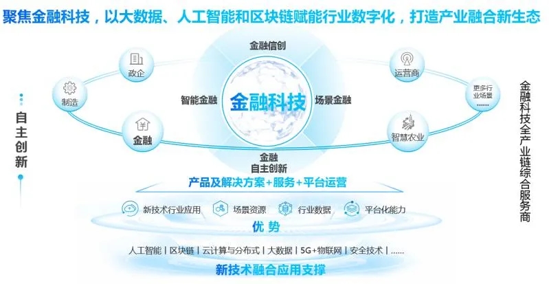 当前,神州信息已形成了“一体三翼”的格局,最底下围绕金融创新布局基础软硬件的业务,中间是围绕着人工智能、大数据、区块链、云计算等新型数字技术驱动自主研发的产品和解决方案落地,最上面是场景金融——围绕场景,包括农业、税务等的场景,助力金融机构在战略和业务层面完成数字化转型,构建开放银行。