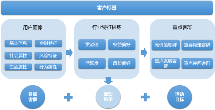 因此,活动策划过程中,明确目标客群及其画像特征和需求特点至关重要。客户标签(图3)通常覆盖基本信息、金融特征、社会属性、风险特征、生活属性、行为属性等板块。结合手机银行客群行为特征,如活跃度、贡献度(贡献度可以围绕金融产品或服务的使用情况,也可以基于邀请分享或登录互动次数)、权益偏好、风险偏好等,可将目标客群进行分层分群,如高价值客群、重点挽回客群、潜力客群等。